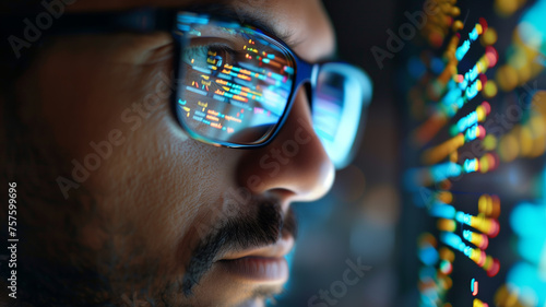 AT engineer reading program code on computer screen. Close-up of eyes and glasses with HTML code reflected. Cyber security and personal data protection