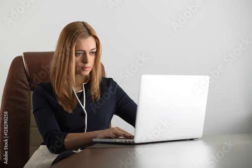 Attractive adult woman sitting at her workstation in the office