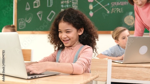 Attractive girl coding prompt while looking at camera at STEM class while happy teacher checking smart boy software program. Diverse student study about programing code and computing system. Pedagogy.