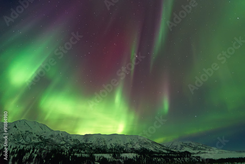 Aurora Borealis over snow capped mountains