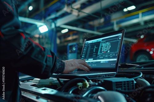 Auto mechanic uses OBD2 tool to check car engine system.