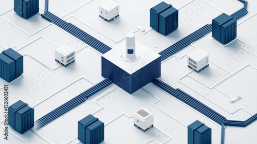 automated efficiency workflow monitoring concept. Abstract 3D model depicting interconnected blocks and a central structure.
