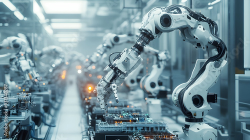 Automated robotic arms assemble intricate electronics on a high-tech production line, showcasing advanced industrial technology and precision.