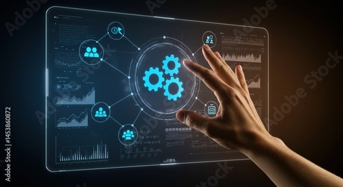 Automation of business or robotic process RPA technology. Futuristic blue interface with charts, icons, and connecting lines in the background.