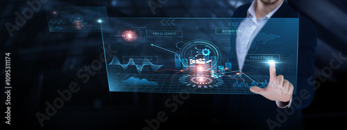 Automation: Process optimization, robotic systems, workflow automation, data integration, machine learning, cost reduction. Businessman analyzing automation progress chart on digital interface.