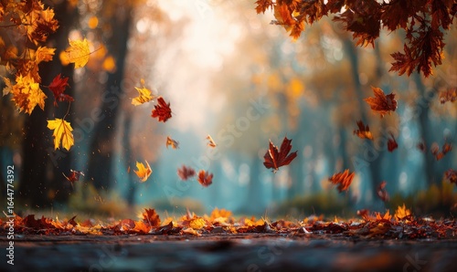 Autumn leaves falling in a park bathed in golden sunlight