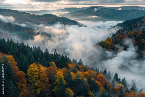 Autumnal Forest Enveloped in Misty Morning