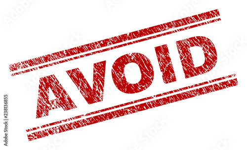 AVOID seal print with corroded texture. Red vector rubber print of AVOID title with retro texture. Text title is placed between double parallel lines.