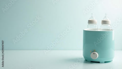 Baby Bottle Sterilizer. Blue baby bottle warmer, two bottles on top, i