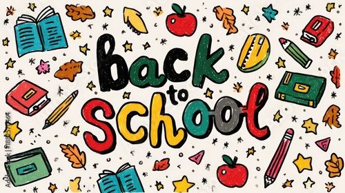 Back to school-themed design, featuring diverse elements such as books, pens, apples, and stars, perfect for educational settings and learning environments