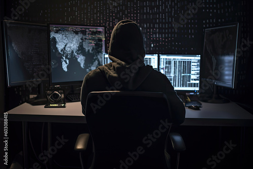 Back view of anonymous man in hoodie using computer in dark room. Cyber crime concept. Created with Generative AI