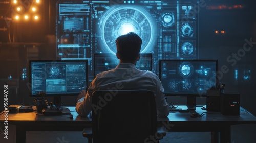 Back view of hacker using computers at desk with glowing robot ai hologram on dark background. Automated machine learning, hacking and artificial intelligence and conversation assistant concept