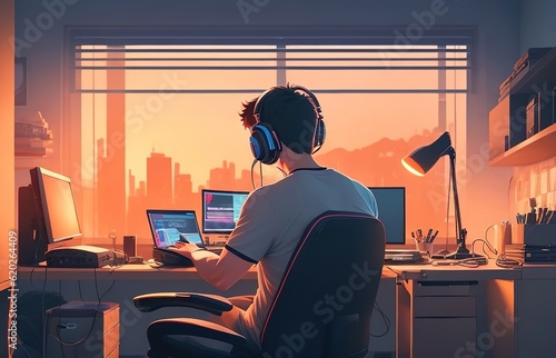 Back View Of Man Working In The Computer On Gaming Room