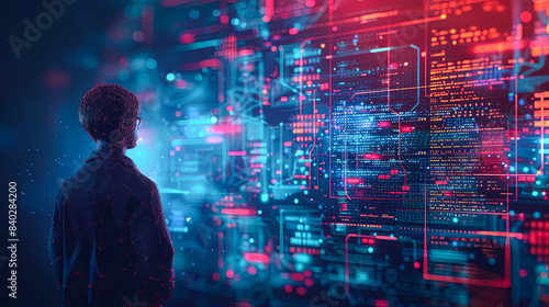 Back view of young hacker using digital code interface. Hacking and malware concept. Double exposure