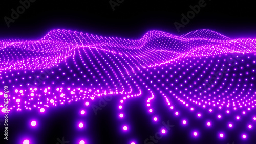 Background 3D with purple lights field, abstract technology design, fantastic sea of neon glowing dots halftone pattern on black, 3D render illustration background.