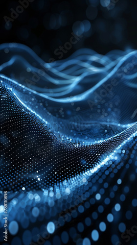 Background, code and networking with blue pattern in dark for cybersecurity, database or information technology. Cloud computing, digital and wallpaper with wave dots for communication or connection