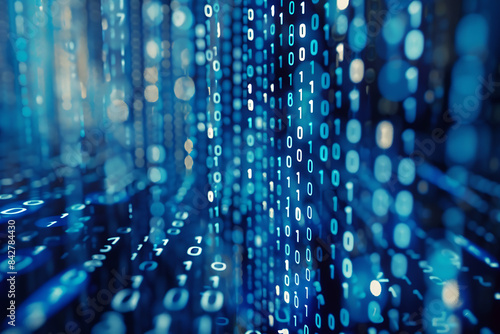 Background filled with cascading binary code, creating a digital and futuristic atmosphere, ideal for technology and programming themes