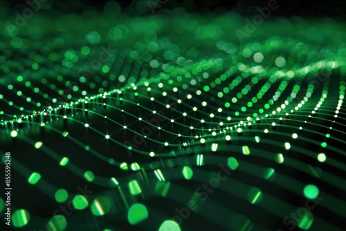 background in green abstract with connected particles and a cyber network grid. Global data connections and artificial neurons.