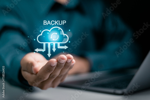 Backup storage data technology concept. Backup online documentation database and digital file storage system or software,file access, doc sharing. Person hold cloud backup icons.