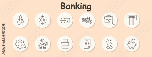 Banking set icon. Arrow, target, person, money stack, percentage, briefcase, ATM, hands, cog, document, location, piggy bank.