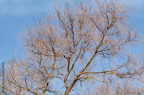 Bare willow crown against clear spring blue sky background