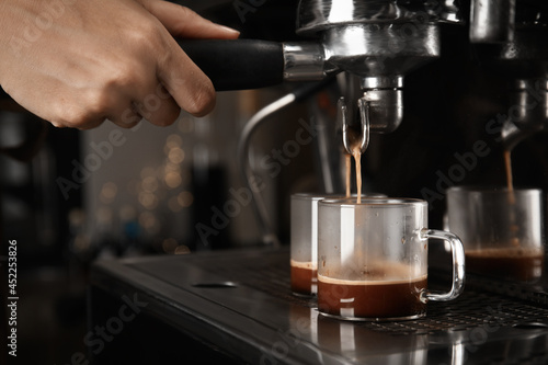 Barista making espresso using professional coffee machine, closeup