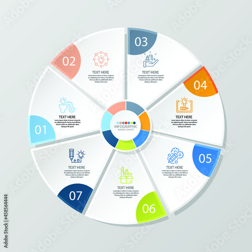 Basic circle infographic template with 7 steps, process or options, process chart, Used for process diagram, presentations, workflow layout, flow chart, infograph. Vector eps10 illustration.