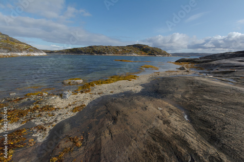 Bay, rocky beach and waves.
