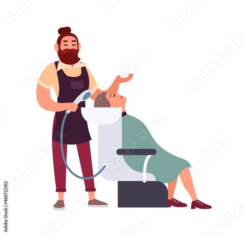 Bearded male hipster hairdresser or stylist washing with shampoo hair of his cheerful female client sitting in chair isolated on white background. Colored vector illustration in flat cartoon style.