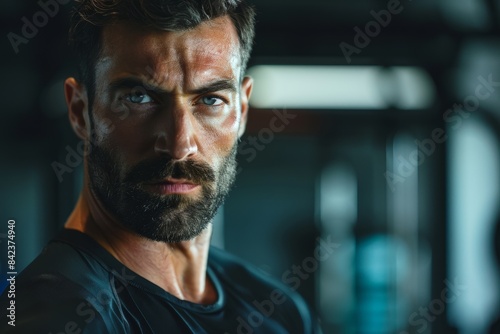 Bearded man in black T-shirt looking at camera with determined expression.