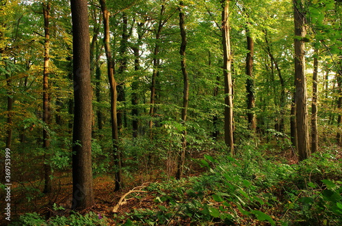 Beautiful Autumn forest landscape forest with trees and sunlight in backgrounds. Peaceful nature and healthy lifestyle concept.