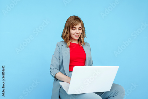 Beautiful caucasian woman is working or studying on her laptop. Office or corporate worker. Blue background.