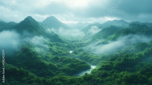 Beautiful Jungle Landscape with Mountains and Fog. Generative AI