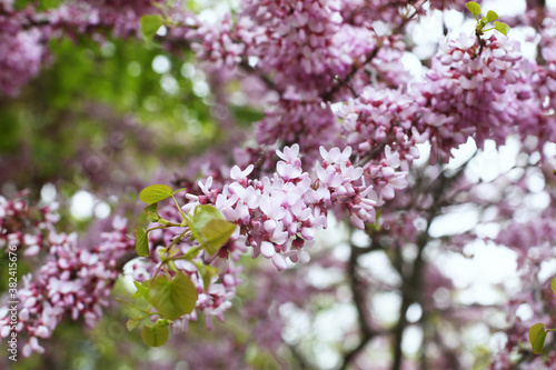 Beautiful pink cherry blossom tree branches in full bloom in the garden or park. Spring background with shallow depth of field.