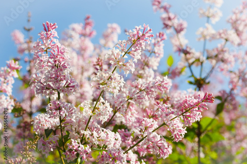 Beautiful pink lilac branch with flowers and buds in the summer garden
