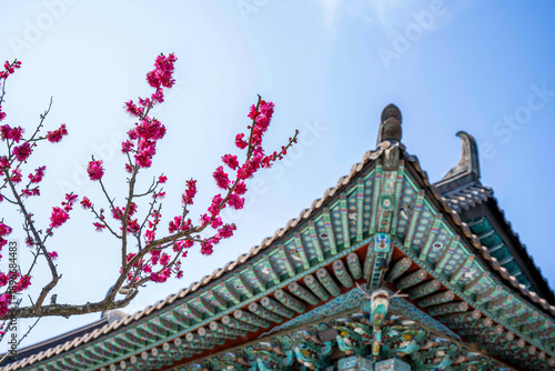 Beautiful red plum blossoms blooming near traditional korean dancheong