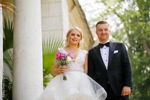 Beautiful wedding couple posing in garden