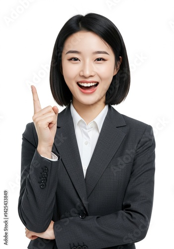 beautiful young woman wearing office clothes with expression has found an idea with hand pointing up happy face