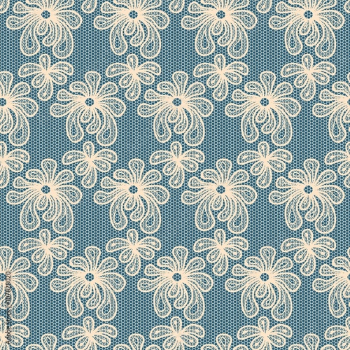 Beige seamless flower lace pattern on blue background