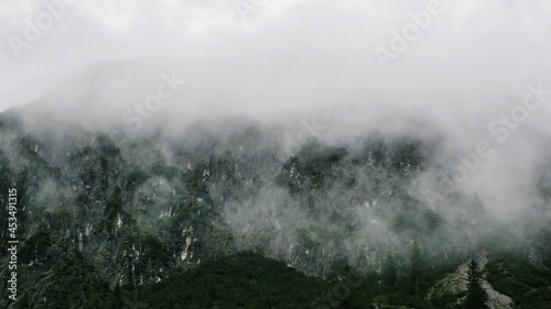 Berge in den Alpen in dichten Wolken und Nebel nach dem Regen im Sommer