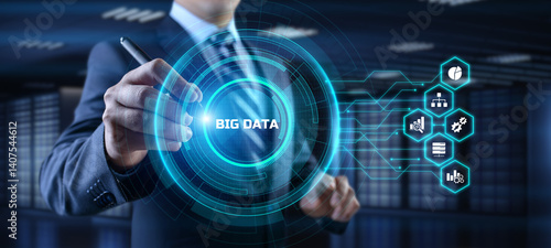 Big Data Analysis Analytics internet technology concept. Businessman pressing button on screen.