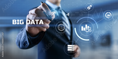 Big Data Analysis Analytics internet technology concept. Businessman pressing button on screen.