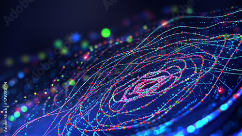 Big data. Business and digital technologies. Data flow in a secure system. Wireless systems, globalization. Data analytics, blockchain technology. 3D illustration of circular paths