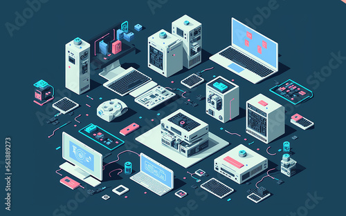 Big data center isometric icon pack, server room rack, engineering process, team work, computer technology, cloud storage, laptop, pc