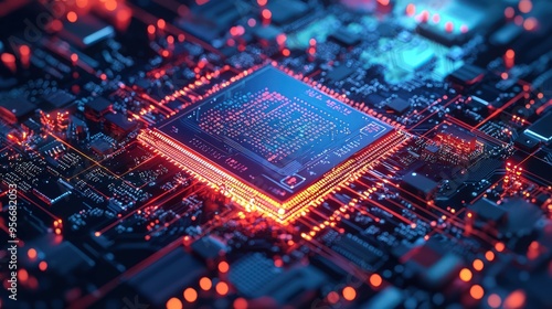 Big Data Flow Diagram Processor and Motherboard 3D with Binary Code and Blockchain