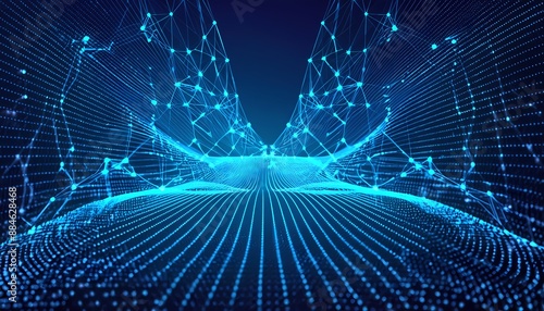Big data visualisation. Abstract digital particles. Cyber network background. Technology concept with lines and doth gloving. Generative ai image
