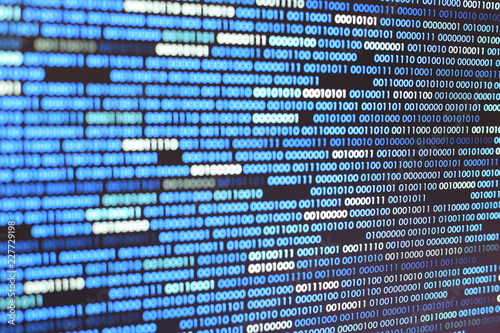 Big overload blockchain data. Blue binary data code background for internet and cyberspace security function. one and zero text on LED moniter screen.