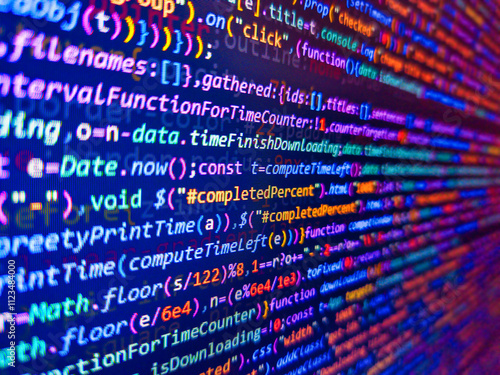Big overload blockchain data. Digital world. Color coding on screen. Developer work. Software development monitor screen background. Binary code. 1100101 blau. Blue monitor and window.