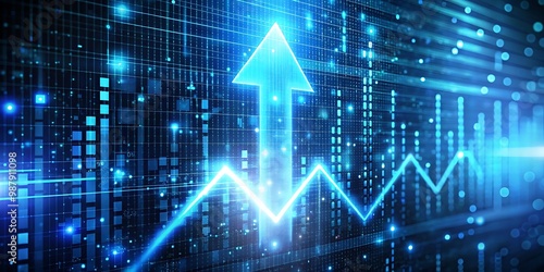 Binary Code and Glowing Lights Form an Upward Arrow 3D Rendered Icon with a Digital Background Representing Technology Growth
