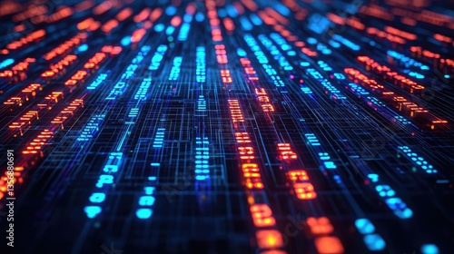 Binary code background and matrix computer technology light concept. Dynamic digital data stream in vibrant blue and red colors.